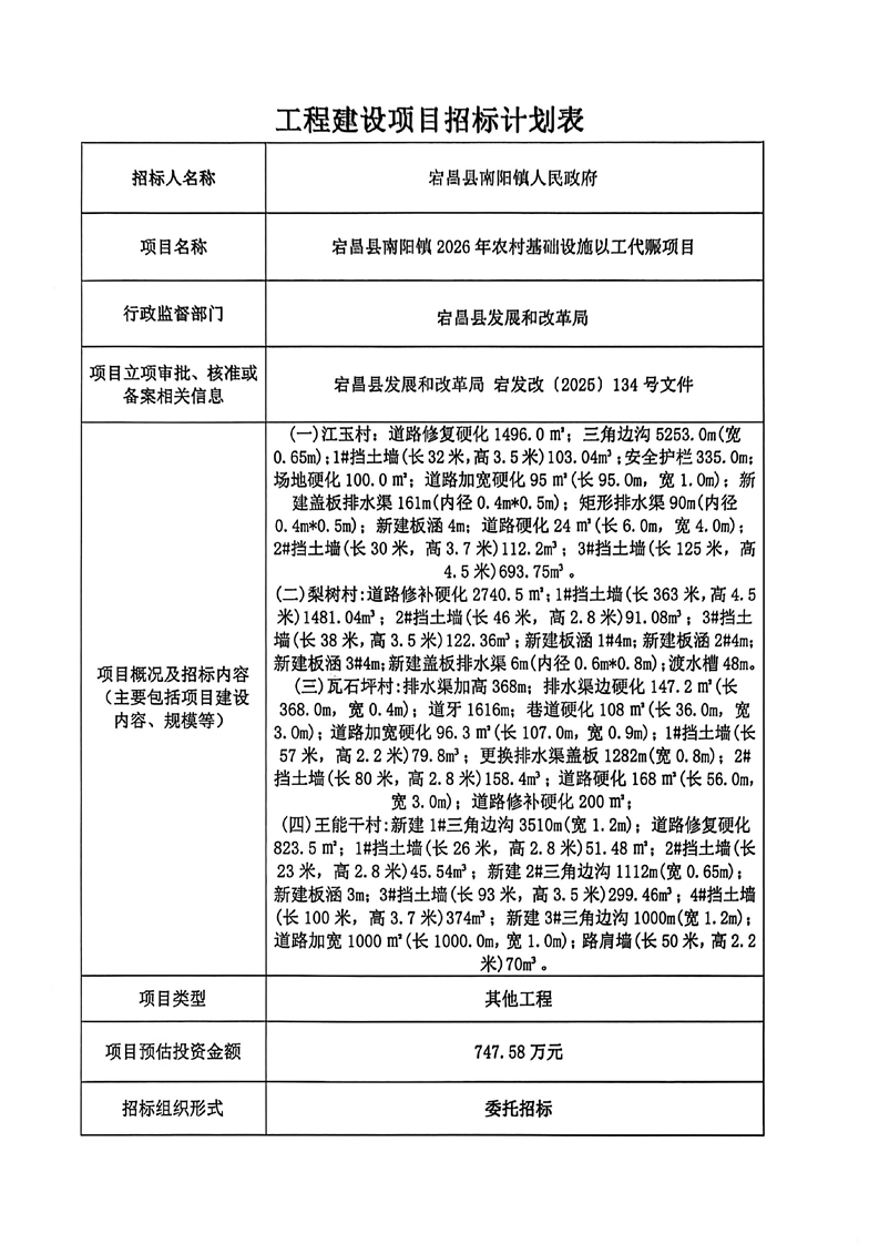 宕昌縣南陽鎮(zhèn)2026年農村基礎設施以工代賑項目