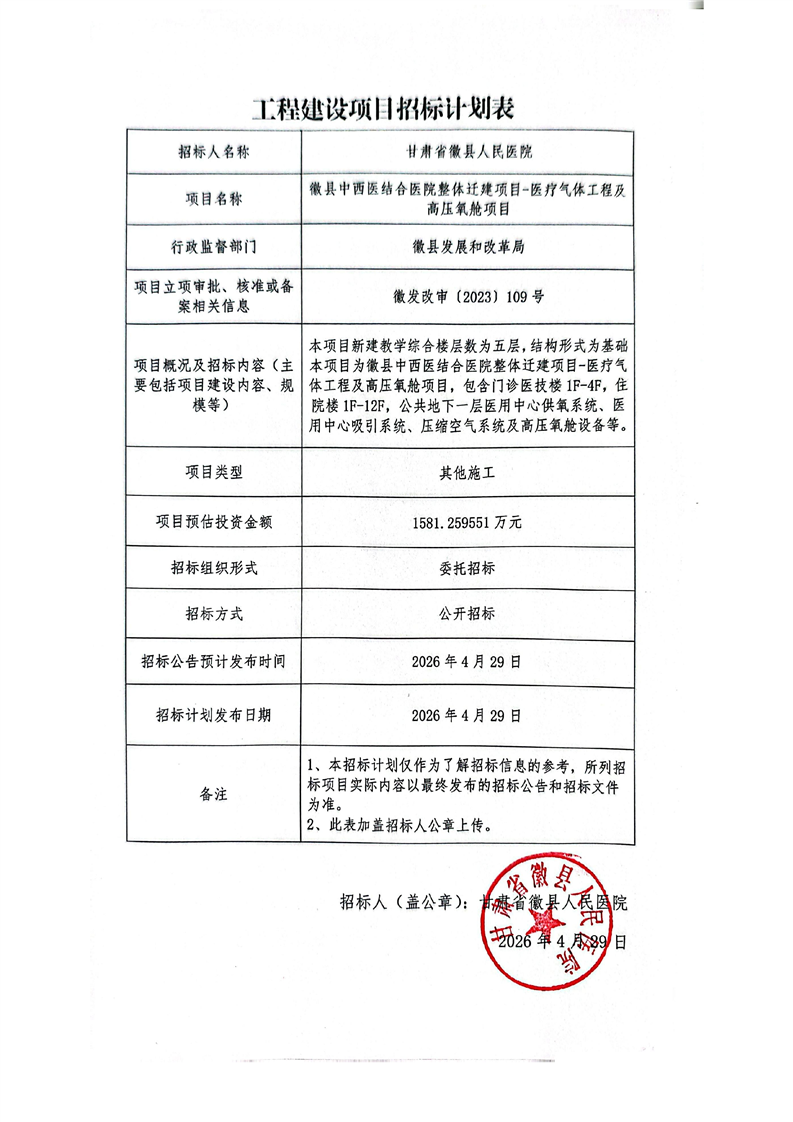 徽縣中西醫(yī)結(jié)合醫(yī)院整體遷建項(xiàng)目-醫(yī)療氣體工程及高壓氧艙項(xiàng)目